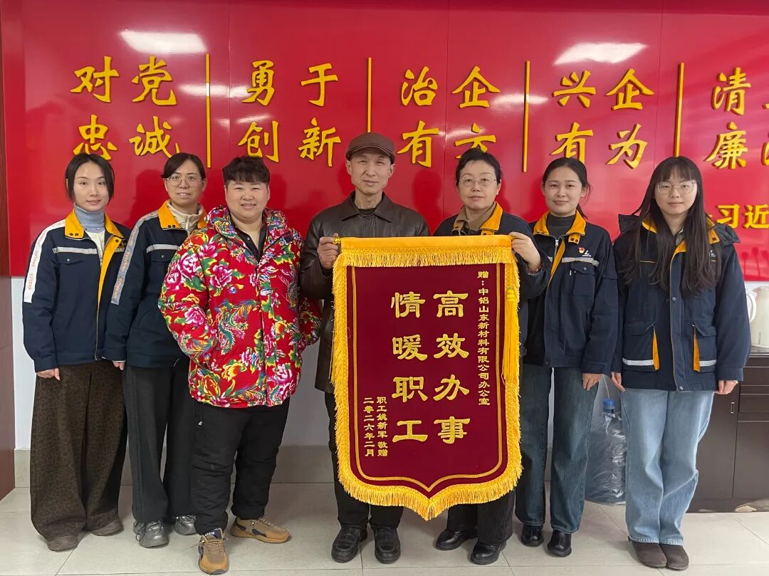 “山东新材料办公室人力资源工作人员效率快,真的太感谢你们了!”近日,在中铝山东新材料二楼会议室,原职工姚新军及家属将一面锦旗送到办公室相关工作人员手中,言语间满是真挚的感激,一句句暖心话语,定格了山东新材料工作人员为职工排忧解难、高效服务的温馨瞬间,也彰显了山东新材料“以职工为中心”的服务初心。