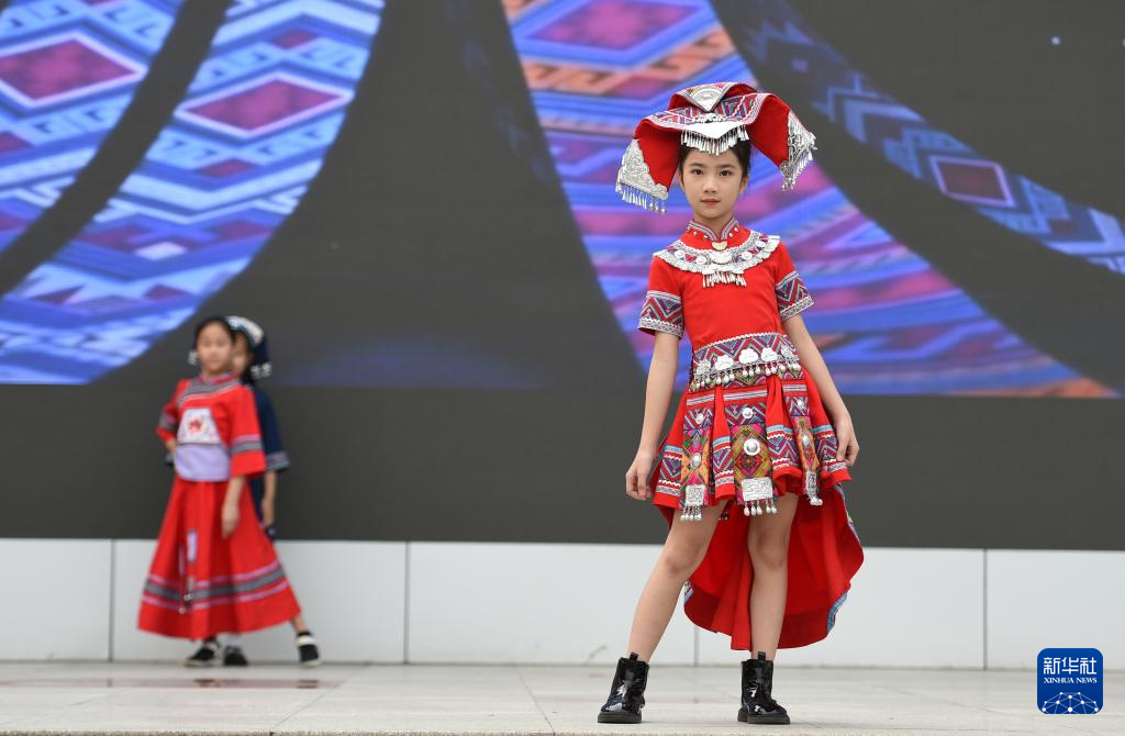 4月13日,广西南宁市滨湖路小学教育集团滨湖校区,学生在表演民族服装秀。