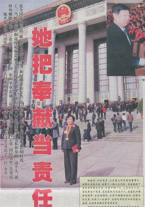 地杰人灵的八百里“水泊梁山”,自古以来就豪杰辈出,名响寰宇。如今这里又出了一位“女杰”,格外耀眼和迷人。论忠诚,她对党、国、家和事业忠诚;说孝慈,她孝敬父母公婆、团结邻里、关爱员工;当她的境界和高度超越忠诚孝慈的时候,她身上特有的“义”让她选择了无私和奉献。这个人,就是全国劳动模范、被温家宝总理誉为“新时期梁山女杰”的山东梁山华宇集团董事长胡桂花。