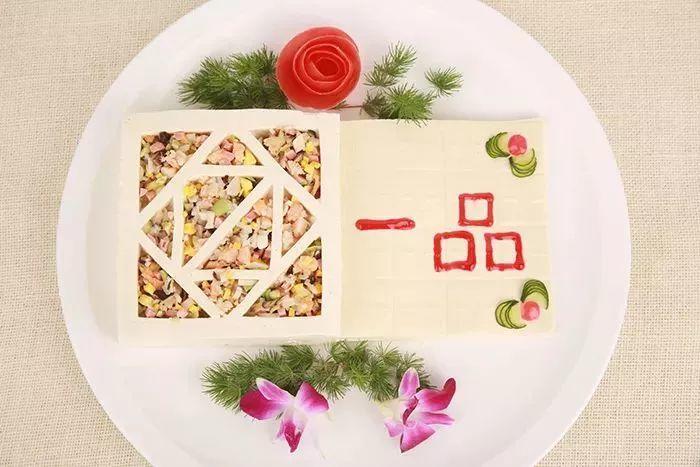 孔府一品豆腐与博山豆腐箱有异曲同工之妙,同样是去除豆腐内核,用干贝、海参、肉沫、银杏等作为内馅儿,只是孔府的一品豆腐,不经油炸,是蒸制的,而且是用一整个大块豆腐来做的。烹制好的一品豆腐,黄白相间,覆着浓郁的鲍鱼高汤汁,内馅更是用料丰富,营养十足,鲜香中带着微辣,可谓是色香味俱全。豆腐虽小,可装“万物”!