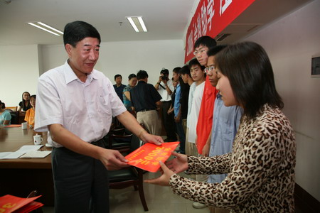捐资助学仪式上,曹民清主席把3000元现金递到贫困职工家庭的孩子手中