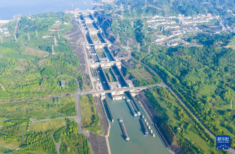 4月18日,船舶有序通过三峡双线五级船闸(无人机照片)。