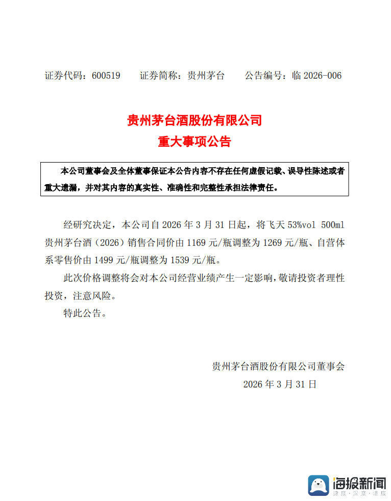 3月30日晚,贵州茅台公告,经研究决定,公司自2026年3月31日起,将飞天53% vol 500ml贵州茅台酒(2026)销售合同价由1169元/瓶调整为1269元/瓶、自营体系零售价由1499元/瓶调整为1539元/瓶。贵州茅台表示,此次价格调整预计将对公司经营业绩产生一定影响。