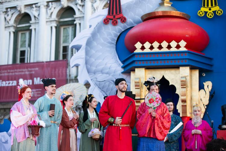 2024年2月13日,在意大利威尼斯,志愿者身着汉服进行表演。新华社记者李京摄