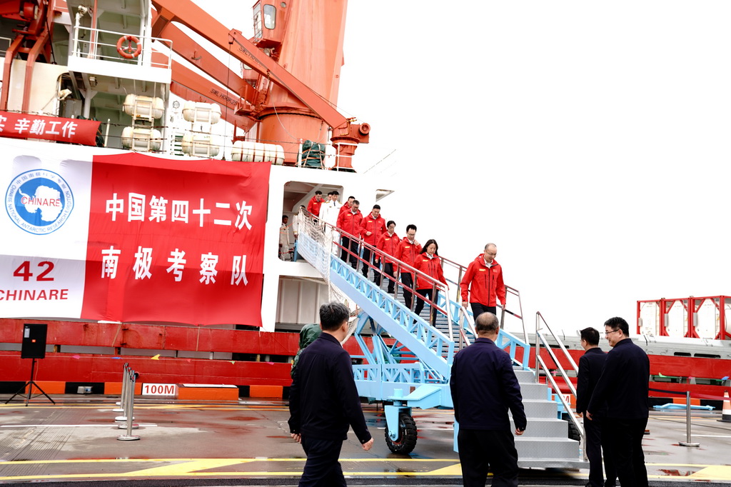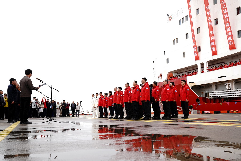 4月9日,历时160天、航程3.4万余海里,执行中国第42次南极考察的“雪龙”号,凯旋归国。550名队员、常规物资补给量超3600吨、内陆考察104天,人员规模和任务量等再创新高;热水钻探刷新世界纪录,国产新装备挺立极寒……这支队伍交出一份中国极地探索能力跃升的答卷。新华社记者 张建松 摄