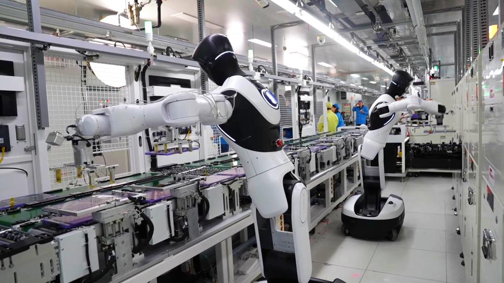 抓取、穿行、对位……近日,在位于江西南昌的上海龙旗科技股份有限公司平板制造工厂内,多台来自智元机器人的“精灵G2”与人类工友并肩作业,在高速流水线上完成精密上下料。实测数据显示,“精灵G2”单道工序耗时18至20秒,每小时可完成310件产品,同时能自动适应产线动态扰动与位置偏差,智能分拣不良品,并与工厂相关系统、测试设备实时数据互通。