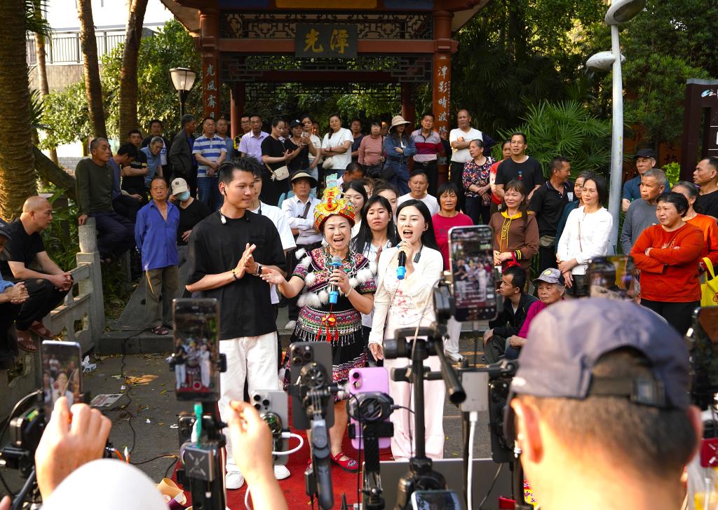 在柳州市鱼峰歌圩,山歌爱好者们在进行山歌直播表演。新华社记者 杨驰 摄