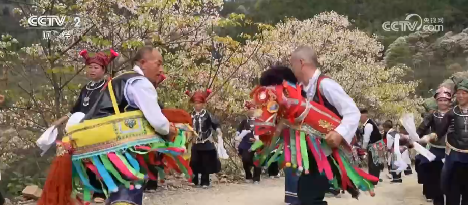 者太乡主要居住着汉、壮、苗、瑶、彝五个民族。为了欢迎赏花的市民游客,村民们穿上民族服饰,在乡间小路上跳起了欢迎舞,还在路边办起特色市集,野菜做的面蒿粑、五色米饭,在这里都能品尝到。