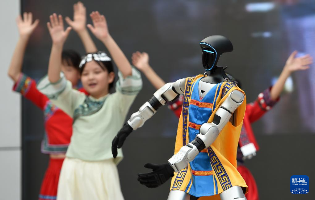 4月13日,在广西南宁市滨湖路小学教育集团滨湖校区,机器人和学生一起表演节目。