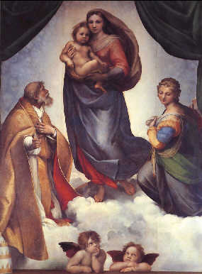 早期的圣母偏重于平民气息,自从来到罗马后,他的圣母像也开始发生气质的变 化,人间的母性转变为女王式的圣母了。这一幅《西斯庭圣母》却兼具两种秉赋,她 既象一位善良的民间女性,又具有女王式的严肃性。圣母抱着圣子降落人间是为了献 出自己的儿子。西斯庭圣母所具有的文雅、温柔与美貌,致使一位俄国画家感慨地赞 美道:“拉斐尔画的圣母,本身就是对人类的想象力的创造。”这一庄严而典雅的圣 母形象,可以说是画家所有圣母像中集大成者,是他最成功的一幅圣母像。 《西斯庭圣母》完成于1514年,是拉斐尔最成功的一幅圣母像。这幅祭坛画,指 定装饰在为纪念教皇西克斯特二世而重建的西斯庭教堂内的礼拜堂里的。最初它被放 在教堂的神龛上,至1574年,一直保存在西斯庭教堂里,故得此名。现为德国德累斯 顿博物馆收藏。拉斐尔在这里创造了一个具有崇高牺牲精神的母性形象。为了拯救人 类,圣母将儿子送向人间。他采用了较为稳定的金字塔形构图,来铺陈这一场面:绿 色帷幕刚刚揭开,圣洁而美貌的圣母赤着双脚,怀抱耶稣,显现在光辉普照的天上, 正徐徐下落来到人间。又似乎正在挪动轻盈的步子,从云端里走下来,但又好象凝滞 不动,露出期望的表情。一对晶莹的目光,注视着苦难的人间。由于圣母还在云中, 身上的衣服被细微的和风飘拂着。被母亲搂得紧紧的耶稣,瞪着两只小眼睛,似乎等 待圣母给他决断未来的命运。这个云中的圣母头上既没有表示神的光环,也不戴宝冠。 连圣母身上的绿色斗篷、红色上衣和褐色头巾也是十分平易近人的,另外毫无华贵的 装饰。作为画面背景的是隐约透现在天光云气中的无数小天使头像。稍不注意,这些 小天使好象是一朵朵团云。画家用这种表现手法为圣母的神圣贡献谱写赞歌。其构思 确实是新颖独到的。