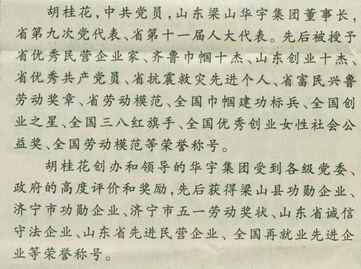 胡桂花原是梁山国棉厂一名工人,1994年因企业遇到困难下岗,依靠党的好政策,经过艰苦曲折、辛勤付出的创业,组建了属于自己的企业。历经十余年的打拼,由最初的500元起家,现已经发展成为集科、工、贸为一体的大型综合性民营企业——山东梁山华宇集团。集团拥有资产3.5亿元,占地面积520多亩,建筑面积15.6万平方米,职工1600多人,其中安排下岗再就业职工1200多人,年产挂车专用车1万辆,棉纱2万吨。2009年销售收入6亿元,实现利税6000万元,上缴税金2300多万元。