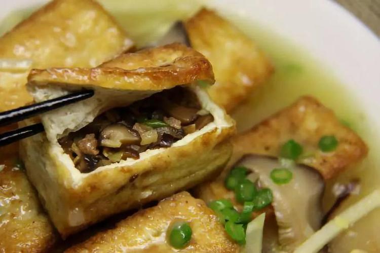 品尝时,轻轻掀开豆腐盖,只见里面是满满的由笋尖、木耳、肉丁混合成的内馅儿,有一种“开箱取宝”的惊喜。