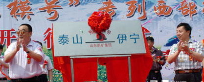 新矿集团党委书记、董事长郎庆田(左)在启程仪式上剪彩