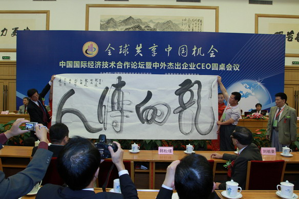 中国名网9月27日讯 中国国际经济技术合作论坛暨中外杰出企业CEO圆桌会议于九月二十五日上午在北京京西宾馆大会堂举行。会议主题是:“全球共享中国机会”。中国国际经济技术合作促进会秘书长滕道阳致欢迎词。在开幕仪式上,中国著名榜书大师、书法家徐一发代表我国书法界,献给大会一幅一丈二尺长的巨大书法作品《龙的传人》,受到国内外与会代表的热烈欢迎。
