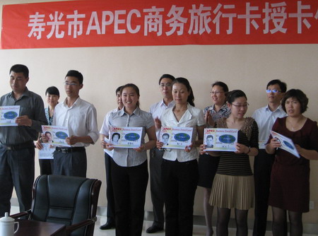 本报讯 5月10上午,APEC商务旅行卡授卡仪式在潍坊寿光举行。这是潍坊市外事与侨务办公室根据上级有关政策,为加快“四个潍坊”建设,推动全市企业拓展海外业务,鼓励和支持符合条件的外向型企业申办APEC商务旅行卡,让更多的企业受益。。这次APEC授卡仪式为晨鸣集团、鲁丽集团、山东万事达机械三家企业12人发放了已获外交部批准的APEC商务旅行卡。