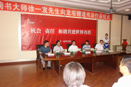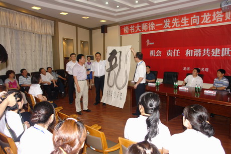 六月三日下午三时整,“龙”字赠送仪式开始。黑龙江省人大秘书长、原省委宣传部长孙启文主持会议。在会议主席台上,于浩总经理代表龙塔有限公司接受徐一发大师赠送的天下第一“龙”,并表示衷心感谢。徐一发大师在仪式上发表了热情洋溢的讲话,详细讲述了巨“龙”创作过程、“龙”文化的丰富内涵和向哈尔滨龙塔赠送“龙”字的心愿。徐一发语重心长的一番话,赢得了与会人员的热烈掌声。