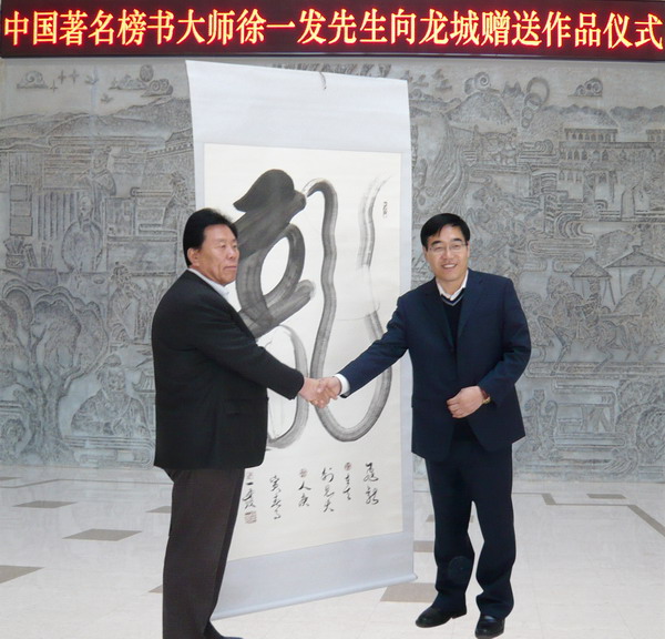 诸城市文化局局长傅相琪发表了热情洋溢的讲话,向与会来宾介绍了徐一发的基本情况和书法艺术生涯。徐一发既是书法家、又是武术家,将自己毕生武学功力融入个人书法之中,艺术造诣颇深,达到了“文到极时是武、武到极时是文”的境界。在赠送作品仪式上,诸城市常务副市长刘作勋代表龙城人民,接受徐一发赠送的两幅巨作:六尺《龙》和一丈二尺《龙的传人》。