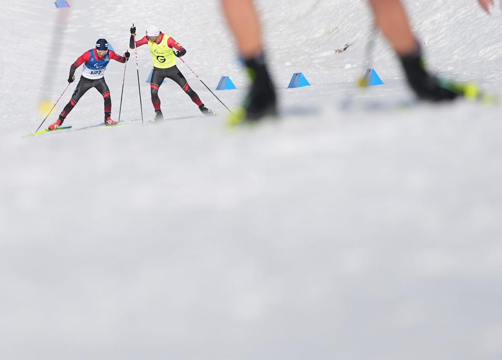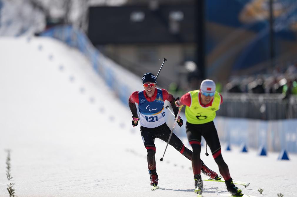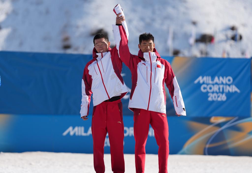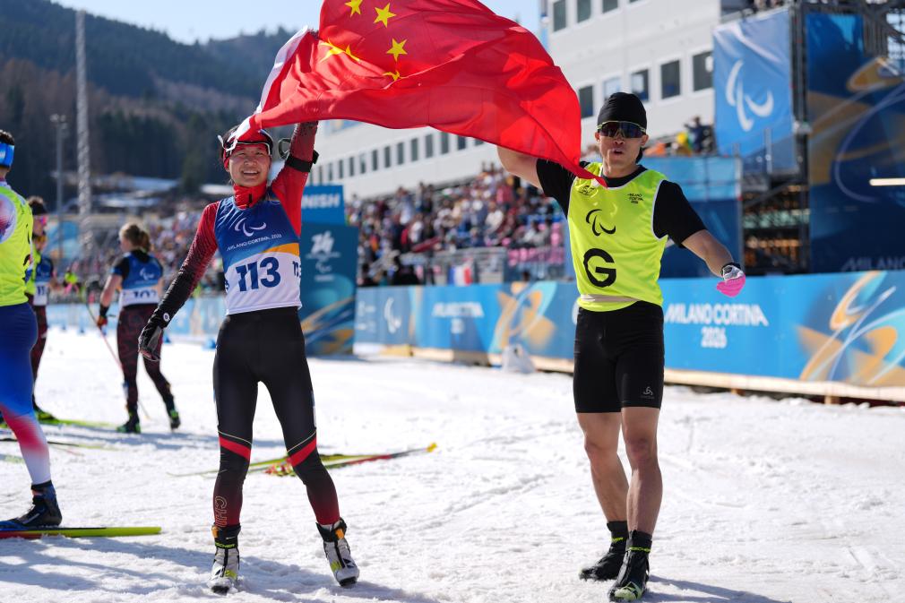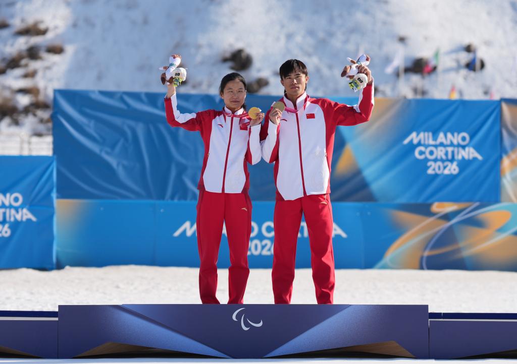 3月8日,中国选手党鹤松(左)与引导员卢宏达在米兰-科尔蒂纳冬残奥会冬季两项男子中距离(视障)比赛颁奖仪式上。