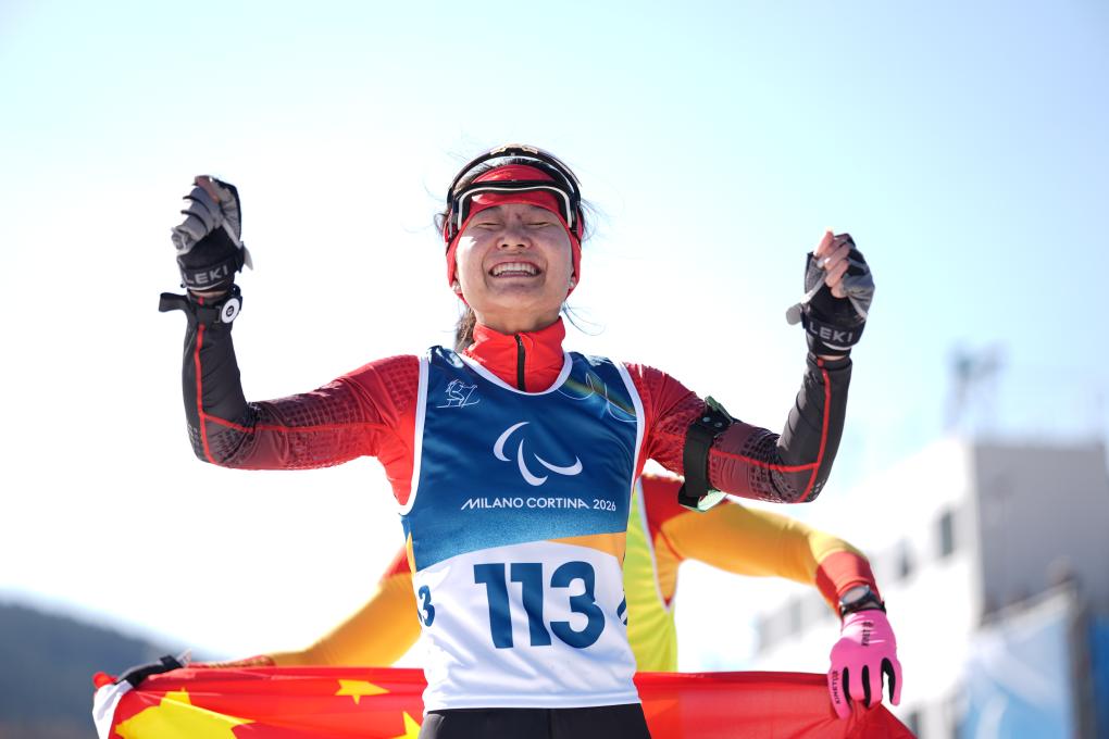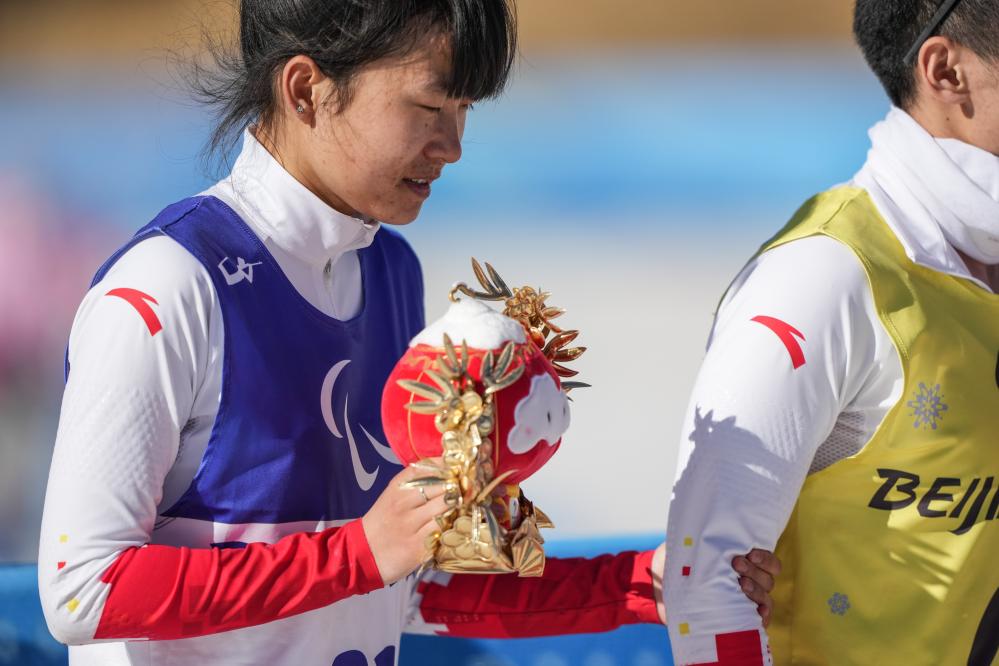 3月8日,中国选手王跃(左)与引导员陈国铭在米兰-科尔蒂纳冬残奥会冬季两项女子中距离(视障)比赛颁奖仪式上。